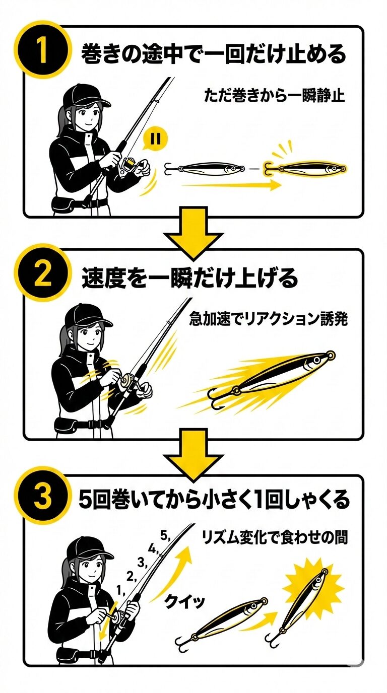 基本はただ巻きで“泳がせ”、途中で一瞬だけテンポを変えて口を使わせるのが効きます。